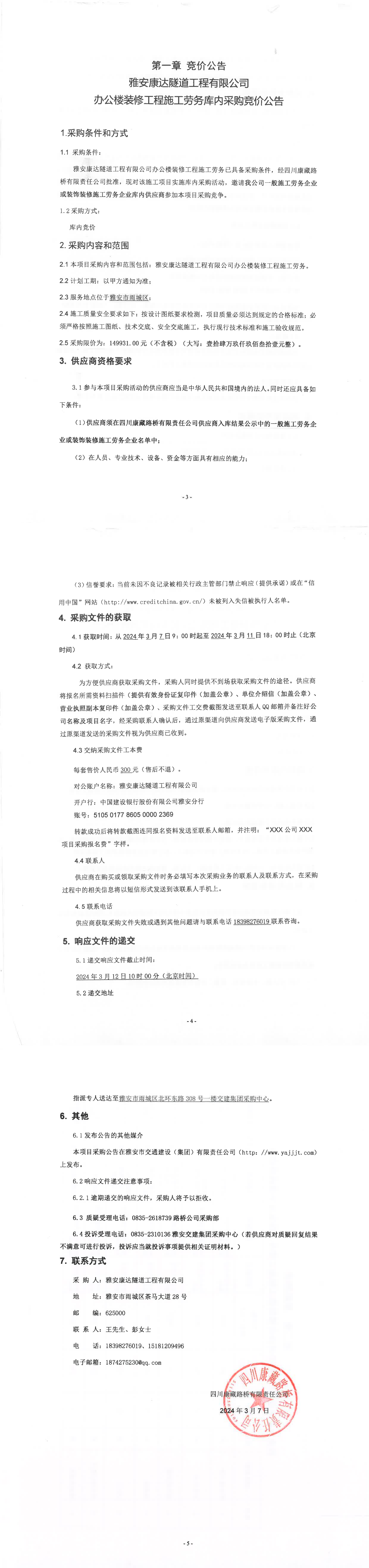 雅安康達(dá)隧道工程有限公司辦公樓裝修工程施工勞務(wù)庫內(nèi)采購競(jìng)價(jià)公告