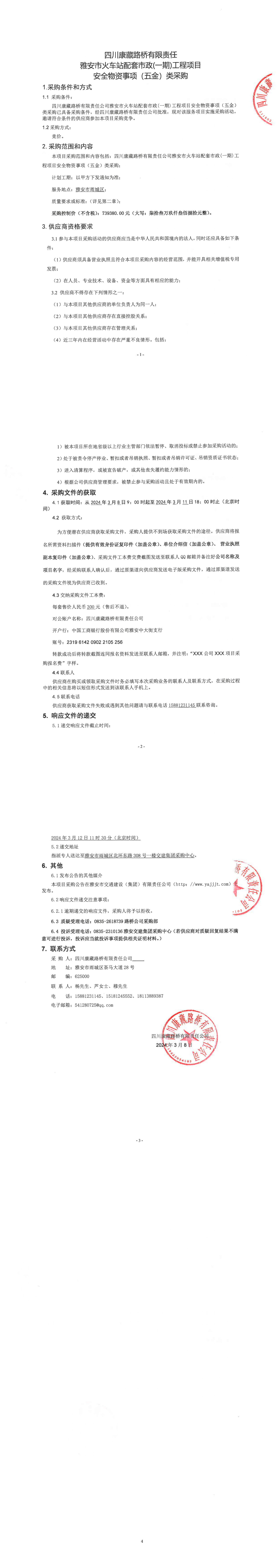 四川康藏路橋有限責(zé)任公司雅安市火車站配套市政(一期)工程項(xiàng)目安全物資事項(xiàng)(五金)類采購公告