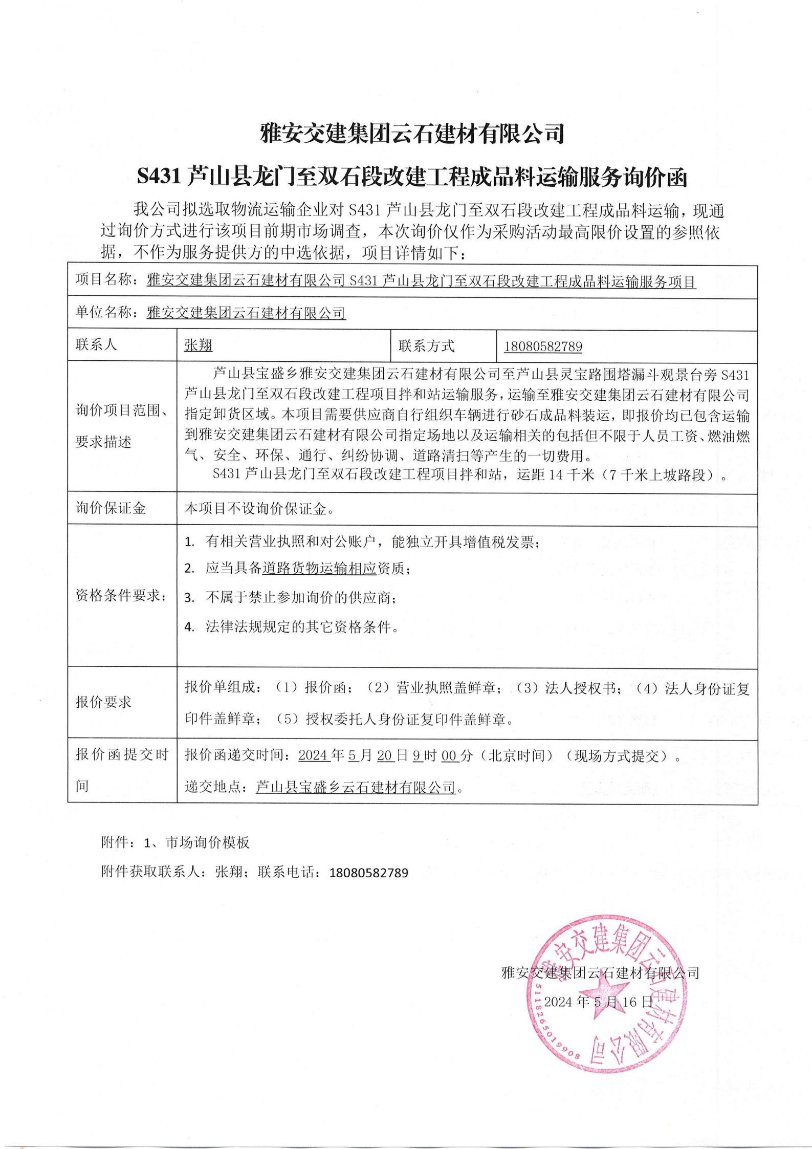 雅安交建集團云石建材有限公司S431蘆山縣龍門至雙石段改建工程成品料運輸服務(wù)項目詢價函