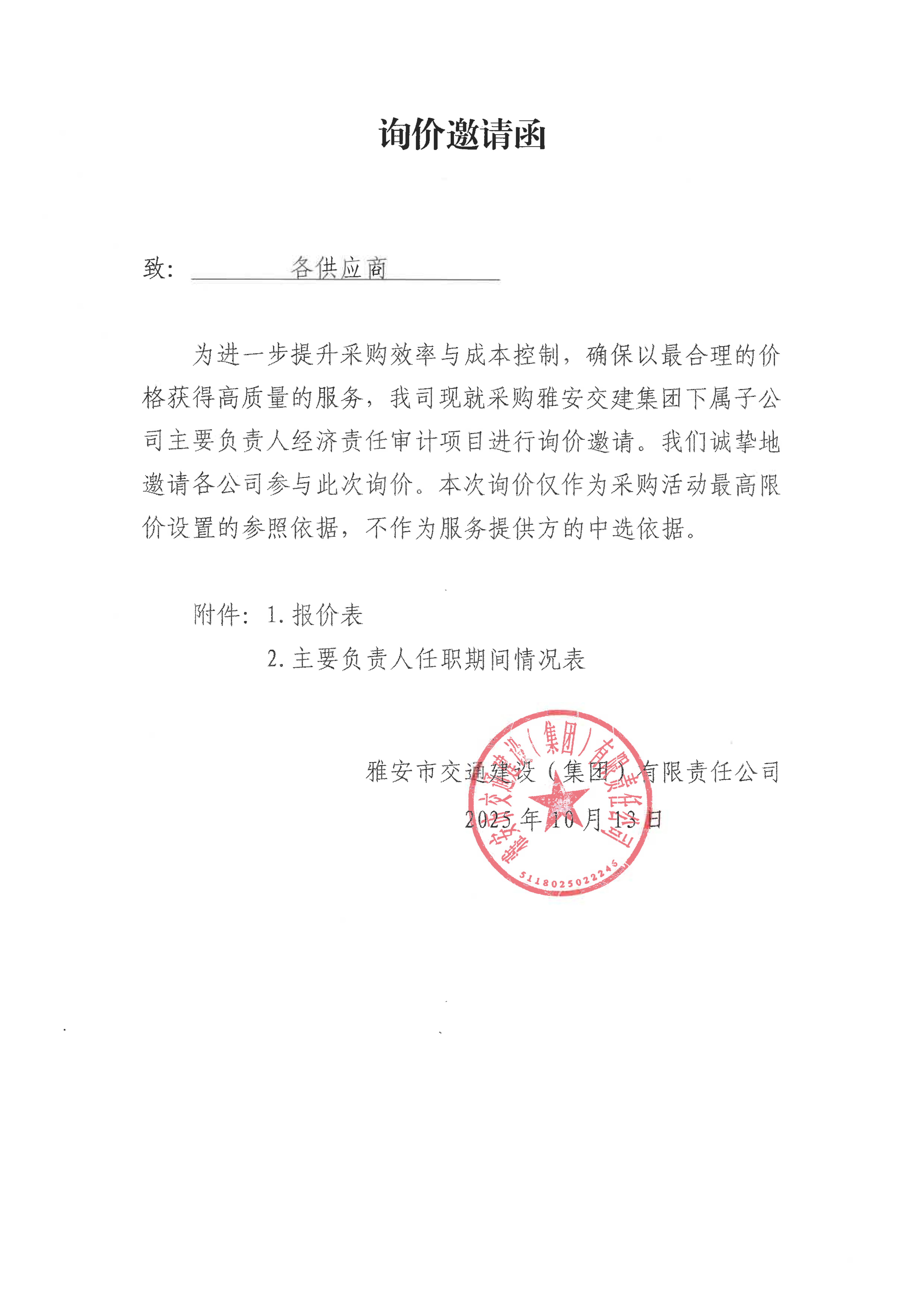 關(guān)于雅安交建集團(tuán)下屬子公司主要負(fù)責(zé)人經(jīng)濟(jì)責(zé)任審計項目限價的詢價函