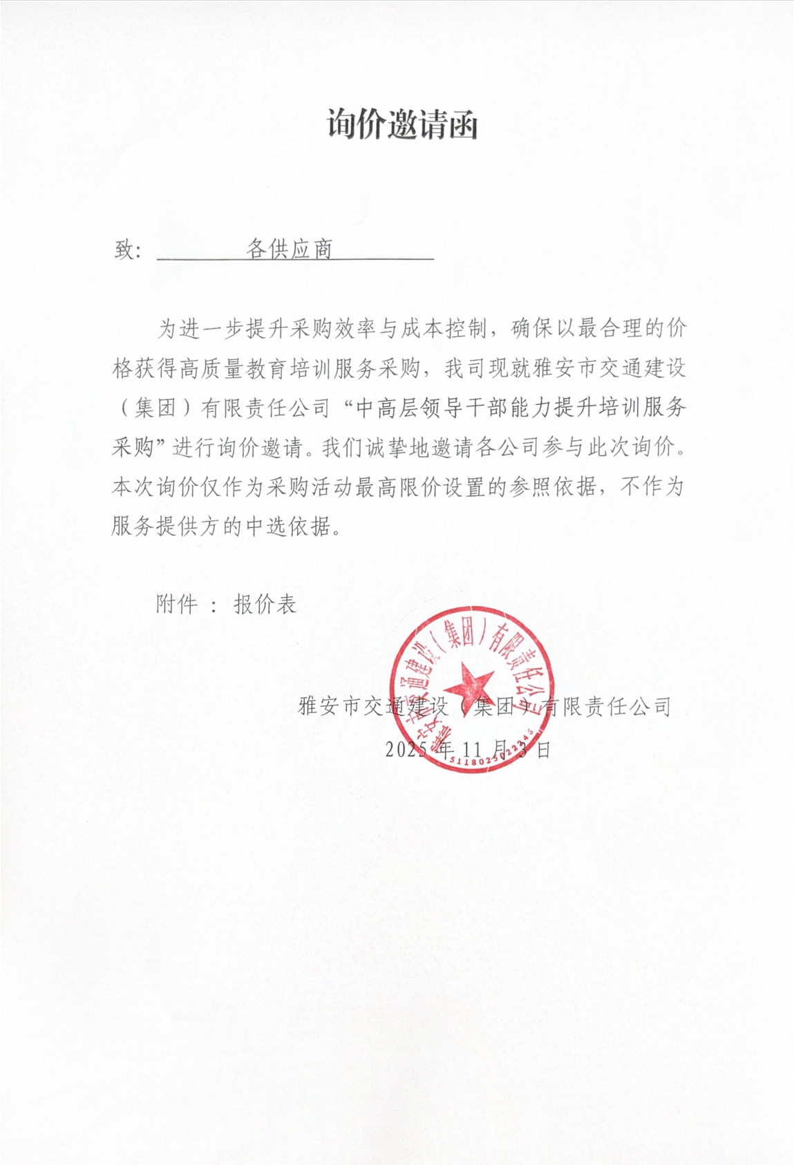 關(guān)于雅安交建集團(tuán)下屬子公司主要負(fù)責(zé)人經(jīng)濟(jì)責(zé)任審計(jì)項(xiàng)目限價(jià)的詢(xún)價(jià)函