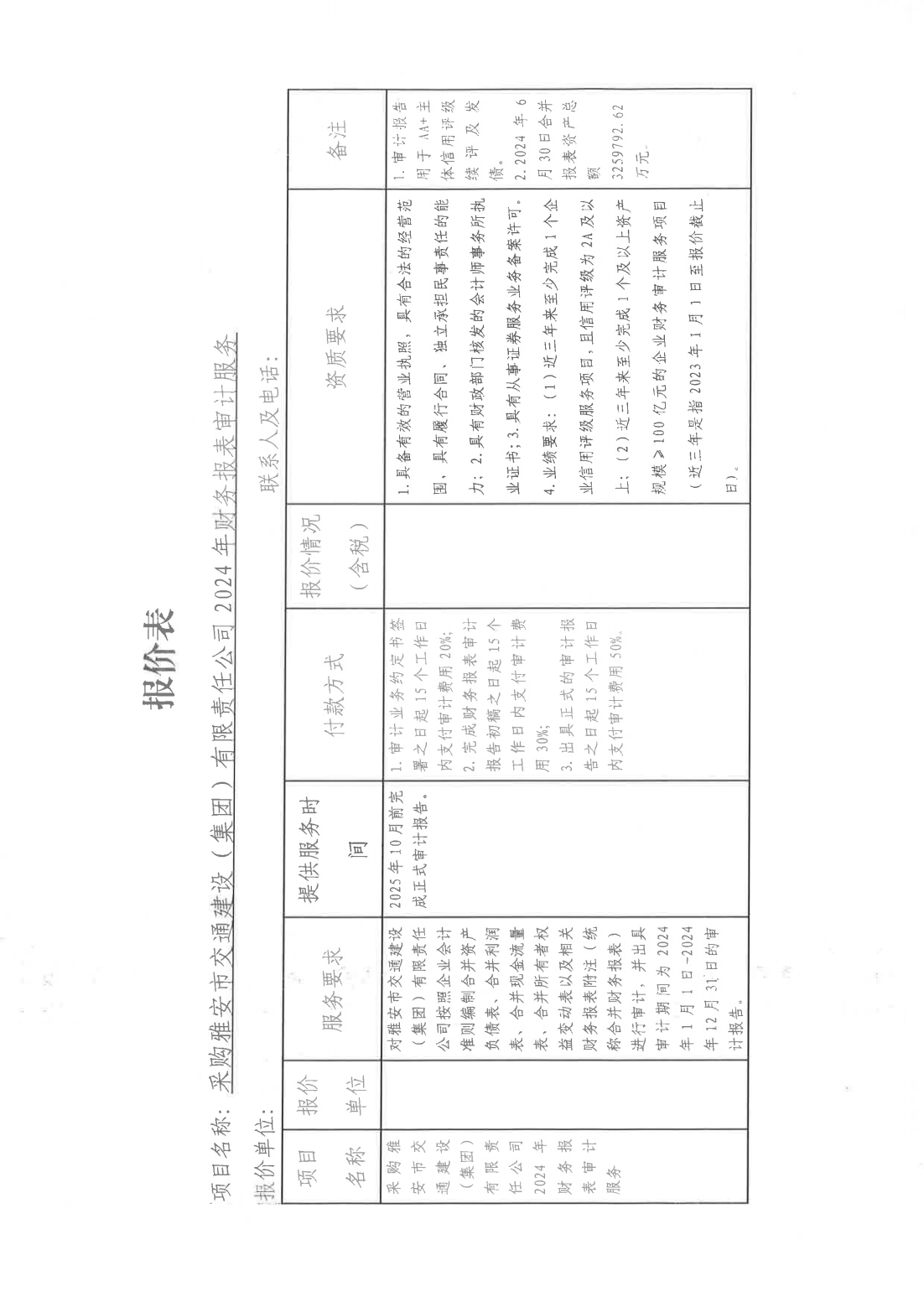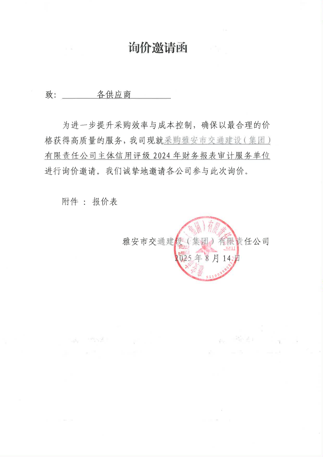 關(guān)于采購雅安市交通建設(shè)(集團(tuán))有限責(zé)任公司主體信用評級2024年財(cái)務(wù)報(bào)表審計(jì)服務(wù)單位的詢價(jià)函