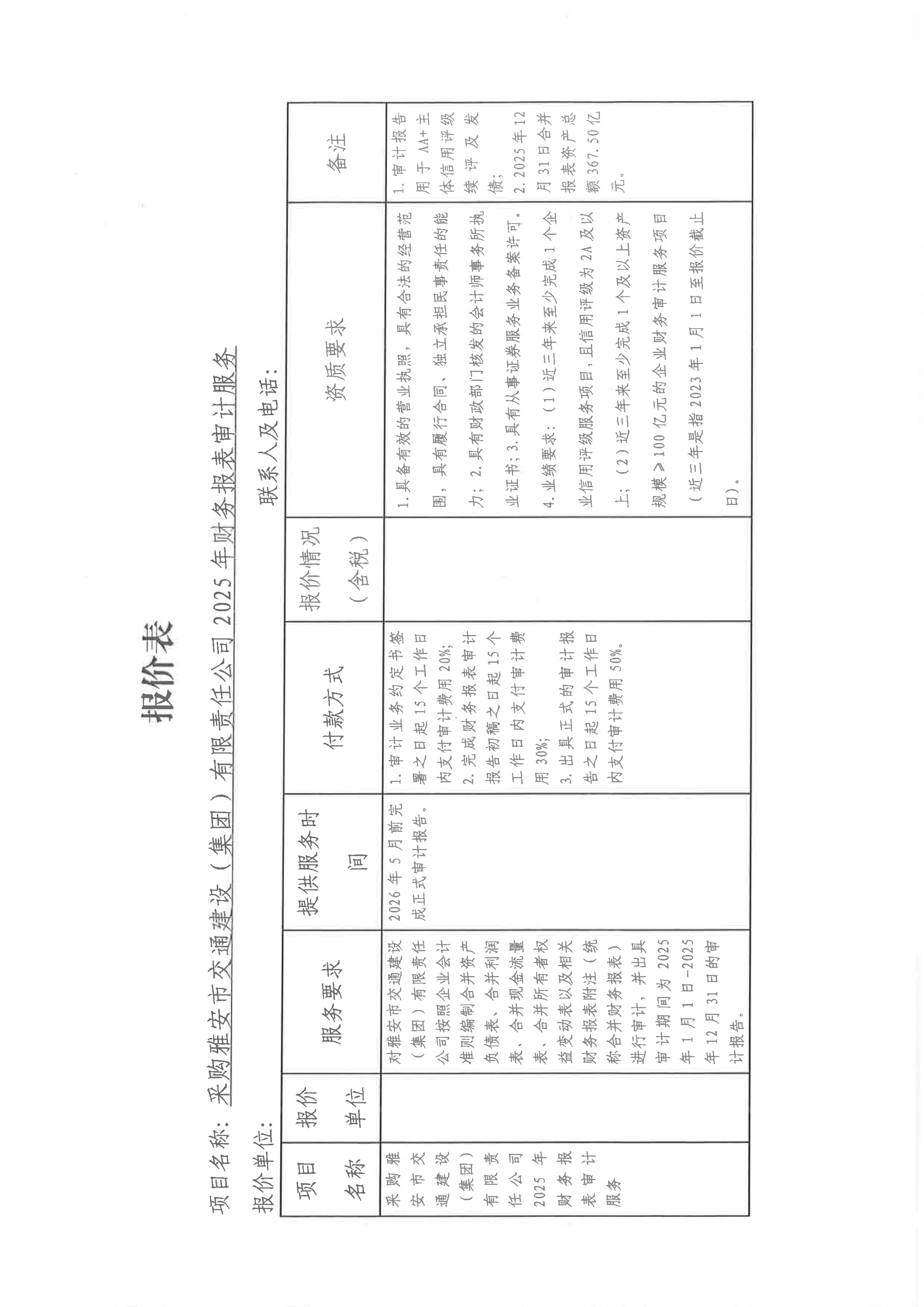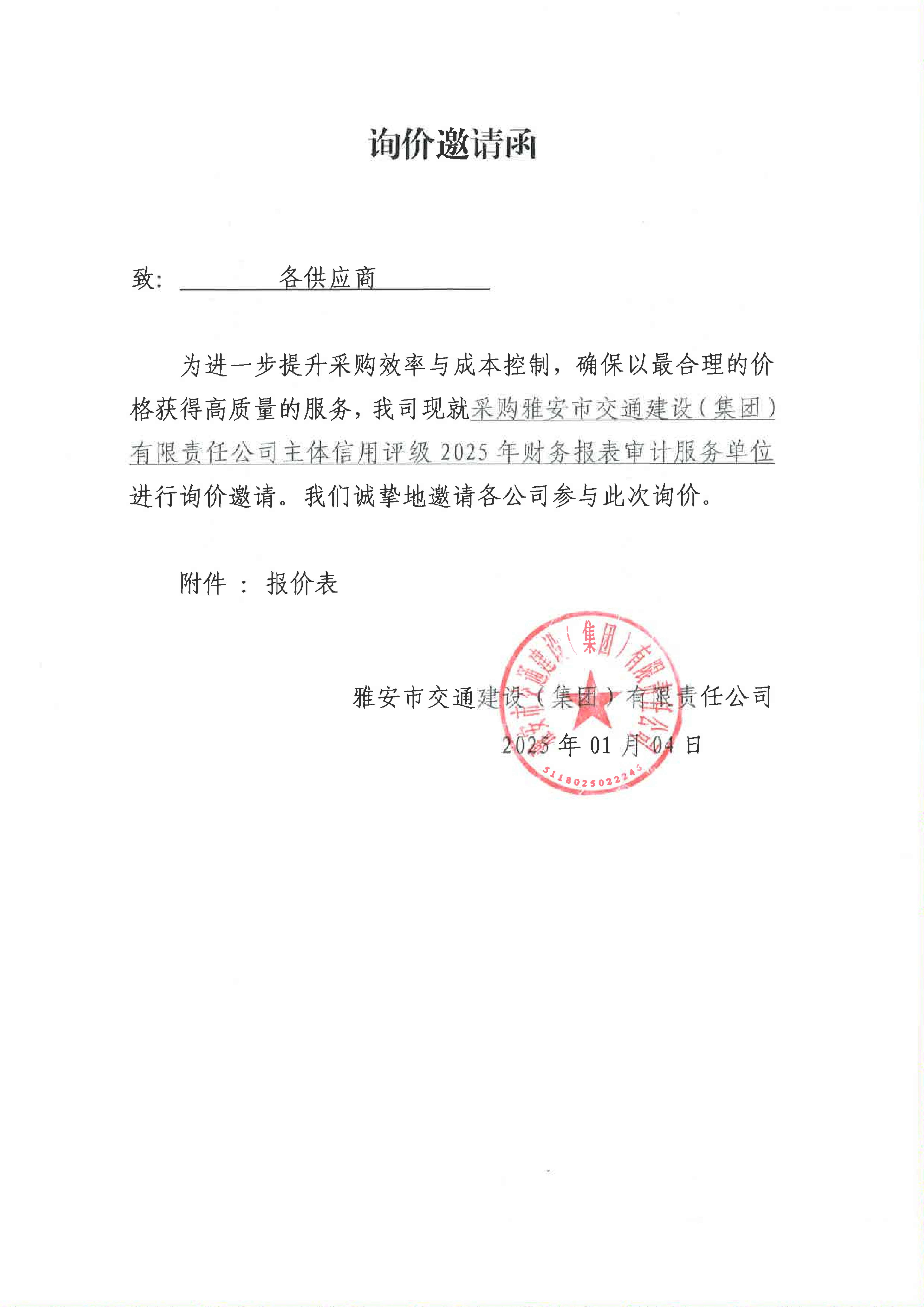 關(guān)于采購雅安市交通建設(shè)(集團)有限責(zé)任公司主體信用評級2025年財務(wù)報表審計服務(wù)限價的詢價函