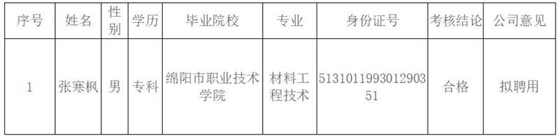 根據(jù)《雅安交建集團康居建設(shè)工程質(zhì)量與室內(nèi)環(huán)境污染檢測有限公司綜合考核聘用工作方案》,按照“公開、平等、競爭、擇優(yōu)”的原則,經(jīng)考核合格,現(xiàn)將我公司擬聘用人員名單予以公示: