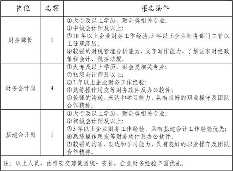 根據(jù)發(fā)展需要,決定面向社會公開招聘雅安市交通建設(shè)(集團)有限責任公司(以下簡稱“雅安交建集團”)所屬子公司財務(wù)部門負責人1名,工作人員5名,現(xiàn)將有關(guān)事項公告如下: