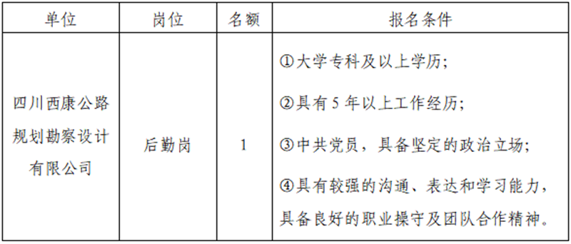 根據(jù)發(fā)展需要,決定面向社會公開招聘雅安市交通建設(集團)有限責任公司(以下簡稱“雅安交建集團”)所屬子公司綜合辦公室后勤崗1名,現(xiàn)將有關事項公告如下: