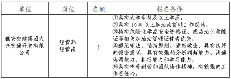 根據(jù)發(fā)展需要,決定面向社會(huì)公開招聘雅安市交通建設(shè)(集團(tuán))有限責(zé)任公司(以下簡(jiǎn)稱“雅安交建集團(tuán)”)所屬子公司工作人員1名,現(xiàn)將有關(guān)事項(xiàng)公告如下: