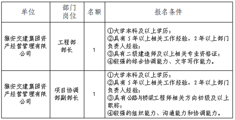 根據(jù)發(fā)展需要,決定面向社會(huì)公開招聘雅安市交通建設(shè)(集團(tuán))有限責(zé)任公司(以下簡(jiǎn)稱“雅安交建集團(tuán)”)所屬子公司工作人員2名,現(xiàn)將有關(guān)事項(xiàng)公告如下: