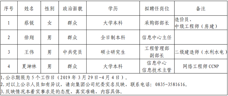經(jīng)雅安市交通建設(shè)(集團)有限責任公司研究,對以下4名擬聘用人員予以公示: