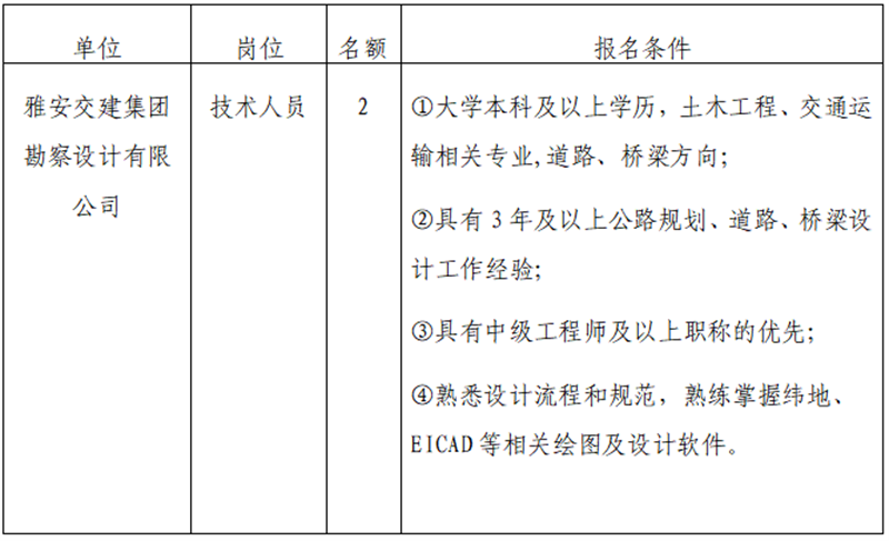 根據(jù)發(fā)展需要,決定面向社會公開招聘雅安市交通建設(shè)(集團(tuán))有限責(zé)任公司(以下簡稱“雅安交建集團(tuán)”)所屬子公司工作人員2名,現(xiàn)將有關(guān)事項(xiàng)公告如下: