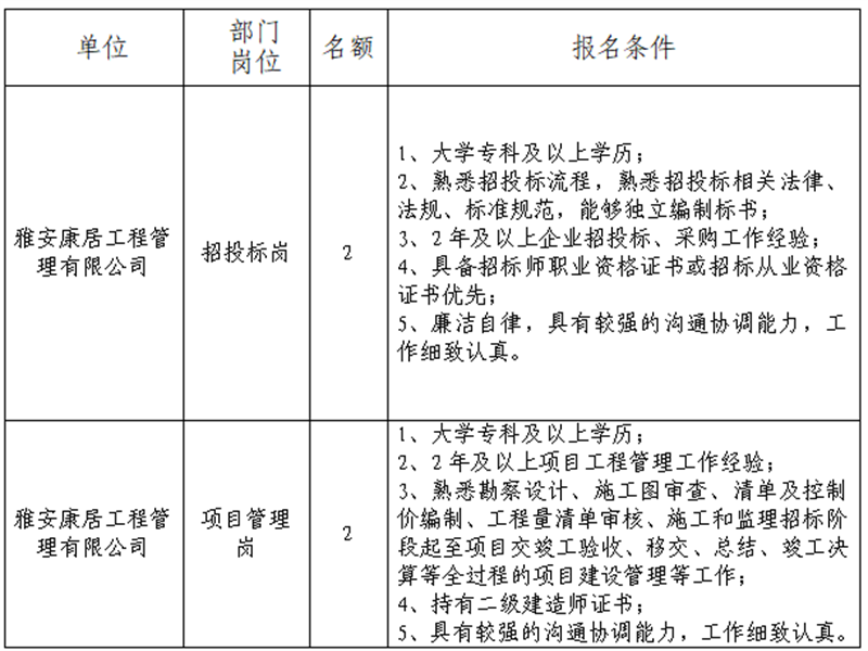 根據(jù)發(fā)展需要,決定面向社會(huì)公開招聘雅安市交通建設(shè)(集團(tuán))有限責(zé)任公司(以下簡(jiǎn)稱“雅安交建集團(tuán)”)所屬子公司工作人員4名,現(xiàn)將有關(guān)事項(xiàng)公告如下: