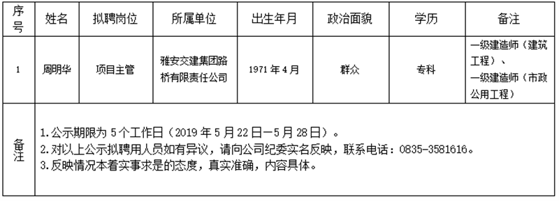 雅安交建集團子公司擬聘用人員公示(路橋公司)