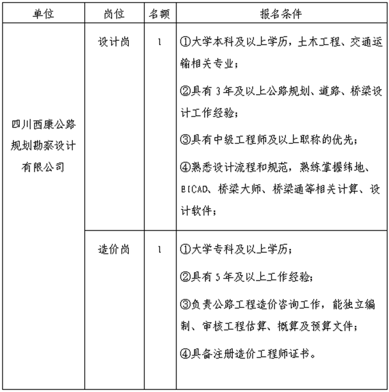 根據(jù)發(fā)展需要,決定面向社會公開招聘雅安市交通建設(shè)(集團)有限責任公司(以下簡稱“雅安交建集團”)所屬子公司工作人員2名,現(xiàn)將有關(guān)事項公告如下: