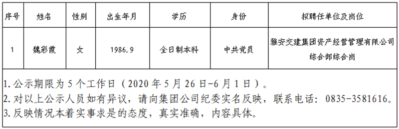 根據(jù)雅安市交通建設(shè)(集團(tuán))有限責(zé)任公司招聘公告,經(jīng)公開報名、資格初審、筆試、面試、體檢考察等環(huán)節(jié),現(xiàn)將以下1名擬聘用人員予以公示:
