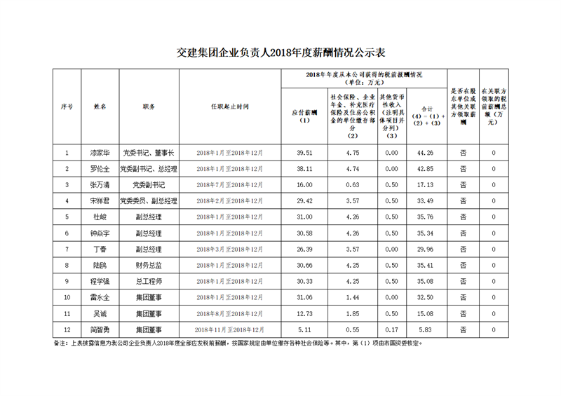 交建集團(tuán)企業(yè)負(fù)責(zé)人2018年度薪酬情況公示表