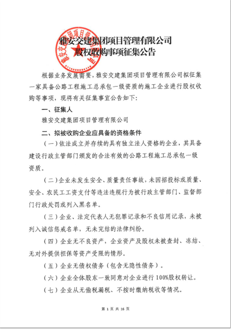 交建集團(tuán)項(xiàng)目公司股權(quán)并購(gòu)事項(xiàng)征集公告