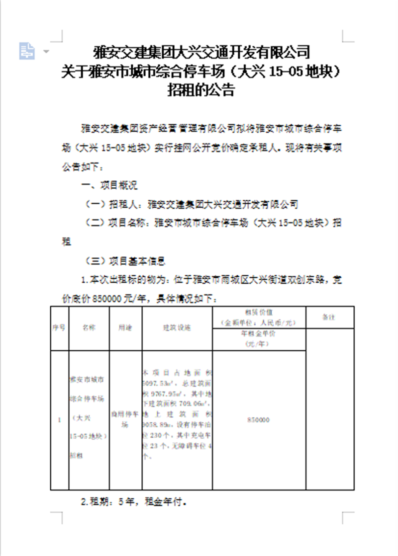 雅安交建集團(tuán)大興交通開發(fā)有限公司關(guān)于雅安市城市綜合停車場(chǎng)(大興15-05地塊)招租的公告