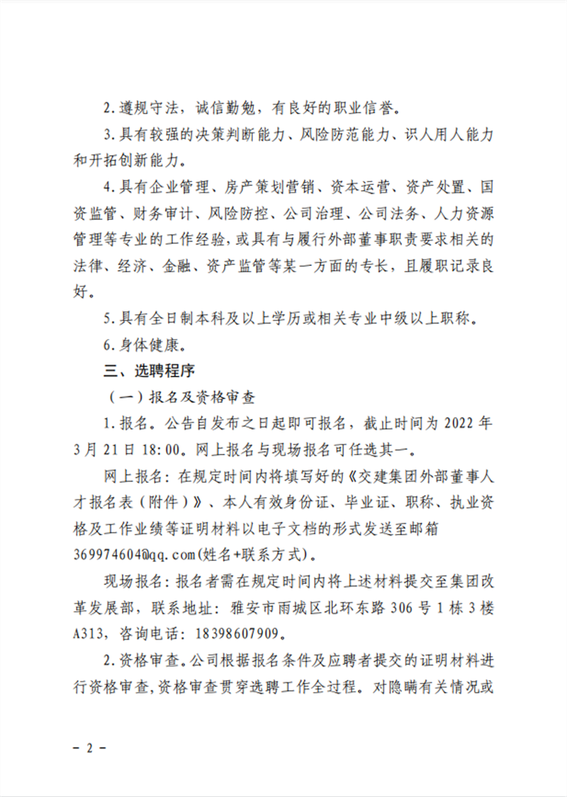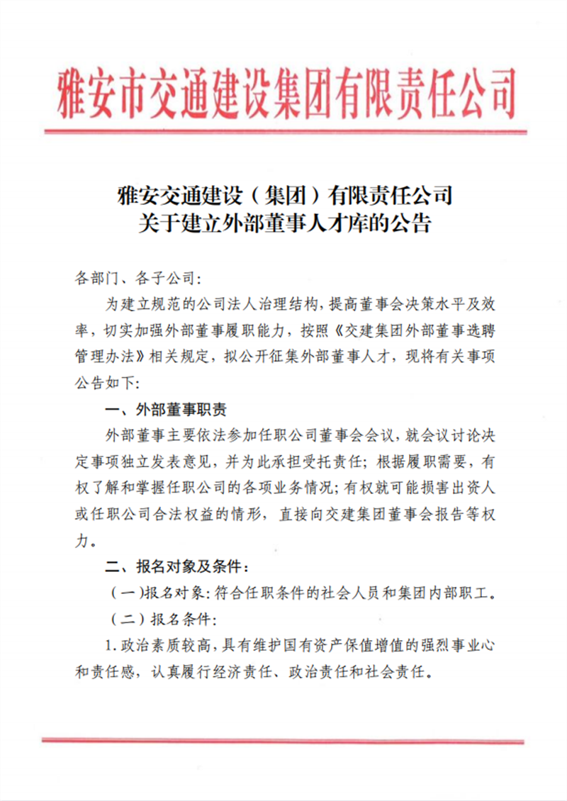 雅安交通建設(shè)(集團(tuán))有限責(zé)任公司 關(guān)于建立外部董事人才庫的公告