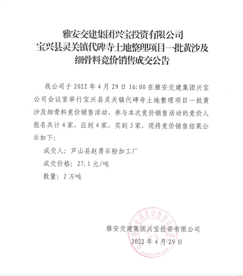興寶公司競(jìng)價(jià)銷(xiāo)售成交公告