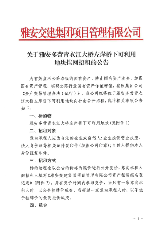 雅安交建集團(tuán)項(xiàng)目管理有限公司關(guān)于雅安多營(yíng)青衣江大橋左岸橋下可利用地塊掛網(wǎng)招租的公告