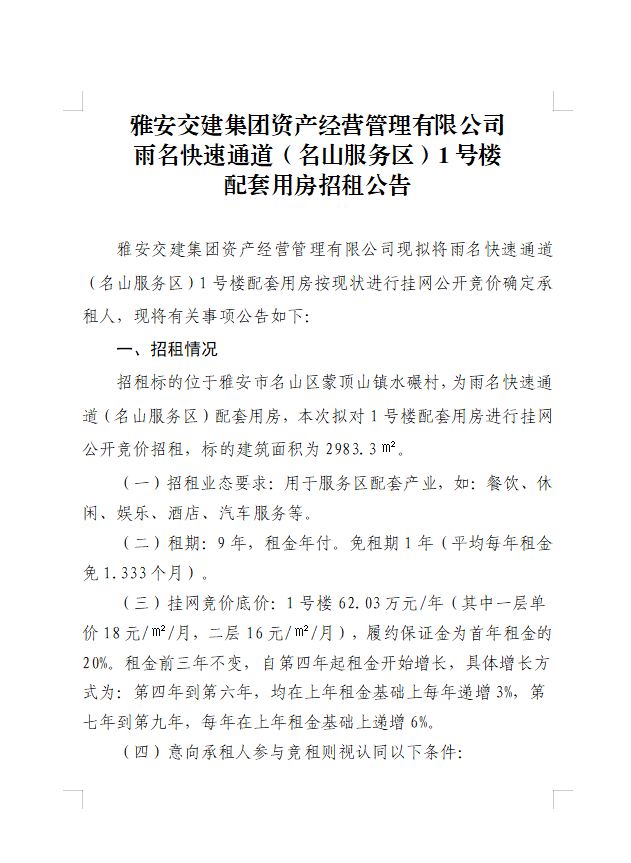 雅安交建集團資產(chǎn)經(jīng)營管理有限公司雨名快速通道(名山服務(wù)區(qū))1號樓配套用房招租公告