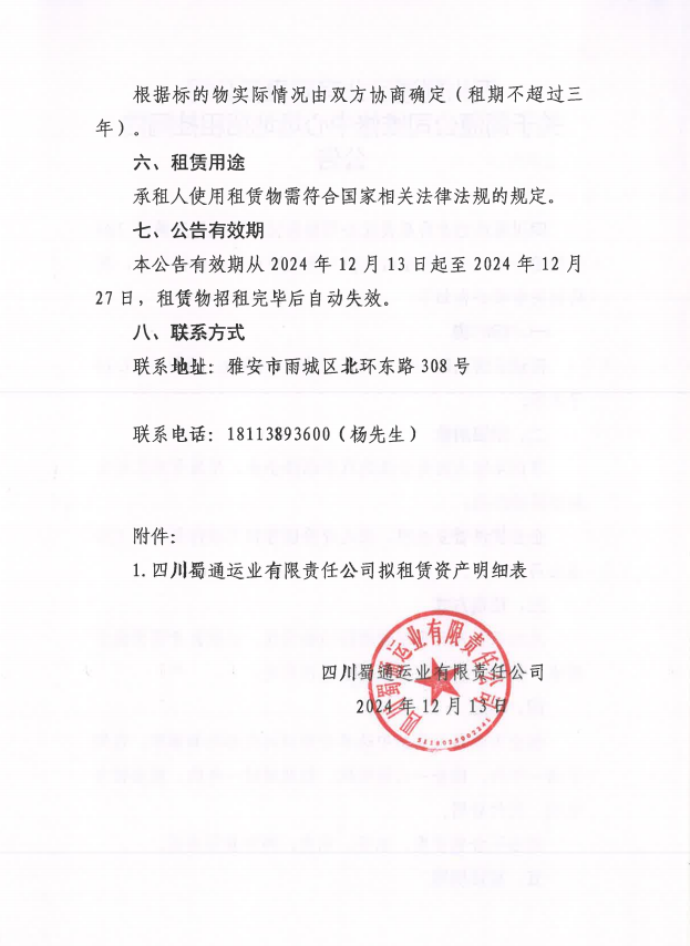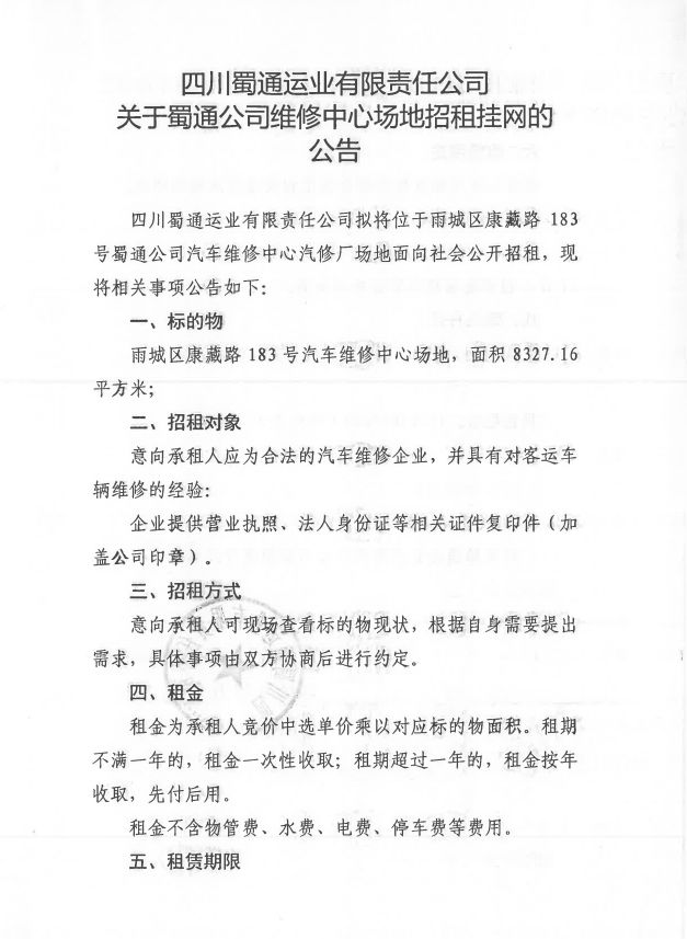 四川蜀通運(yùn)業(yè)有限責(zé)任公司 關(guān)于蜀通公司維修中心場地招租掛網(wǎng)的 公告