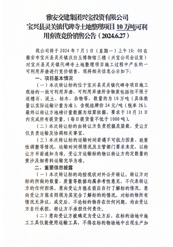雅安交建集團(tuán)興寶投資有限公司寶興縣靈關(guān)鎮(zhèn)代碑寺土地整理項目10萬噸可利用棄渣競價銷售公告(2024.6.21)