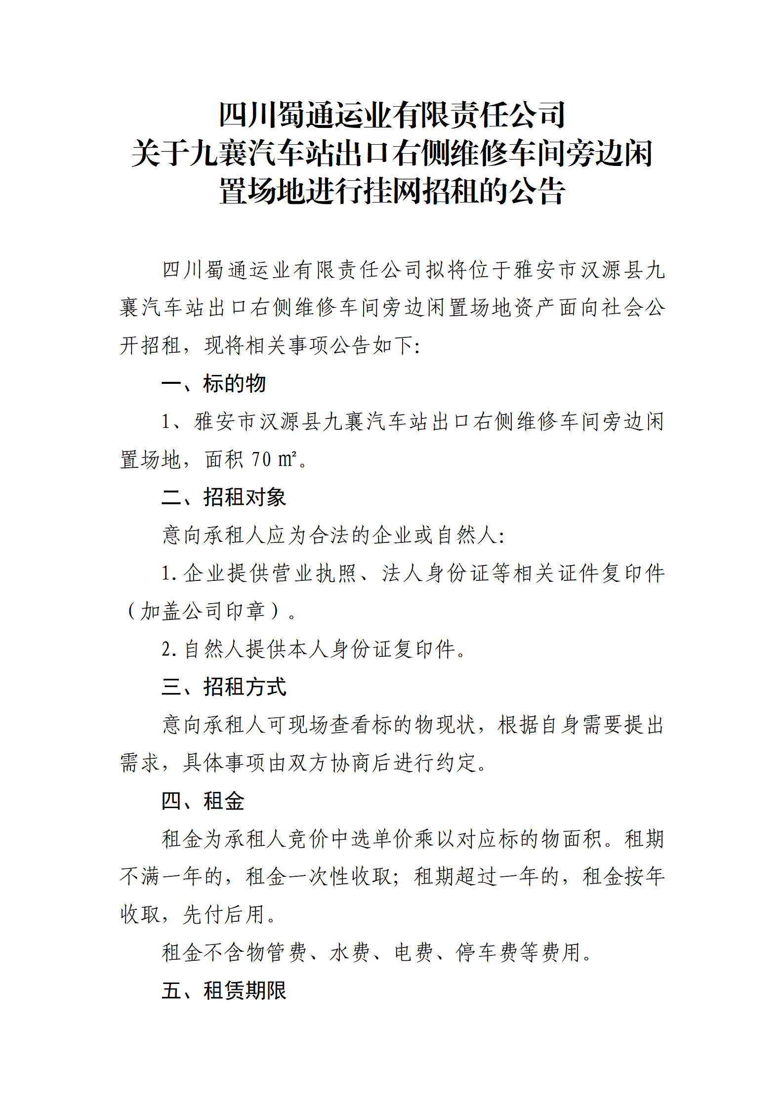 四川蜀通運業(yè)有限責任公司 關于九襄汽車站出口右側維修車間旁邊閑置場地進行掛網(wǎng)招租的公告