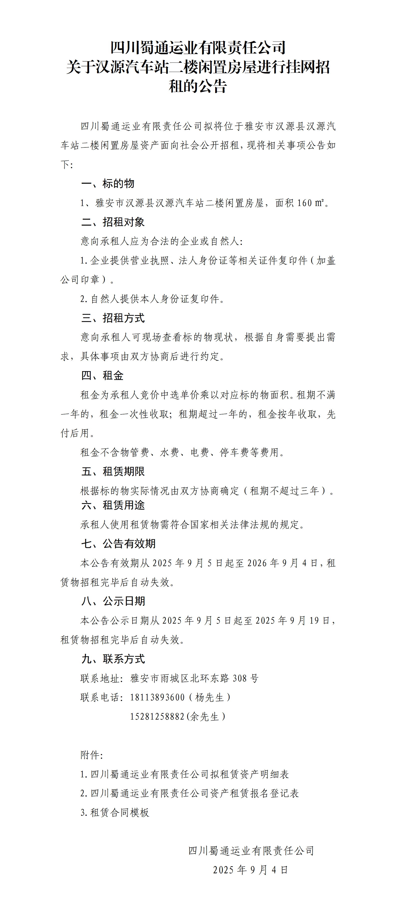 四川蜀通運業(yè)有限責任公司 關于漢源汽車站二樓閑置房屋進行掛網(wǎng)招租的公告