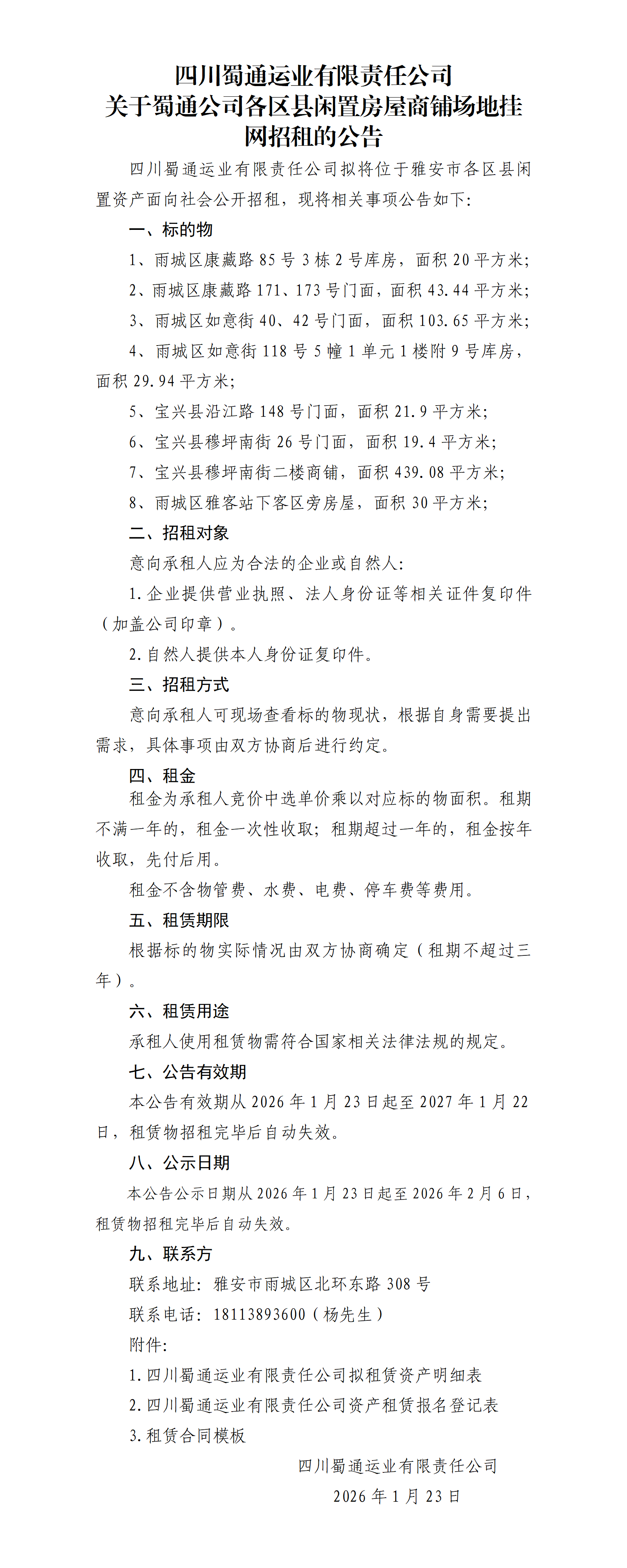四川蜀通運(yùn)業(yè)有限責(zé)任公司關(guān)于蜀通公司各區(qū)縣閑置房屋商鋪場(chǎng)地掛網(wǎng)招租的公告