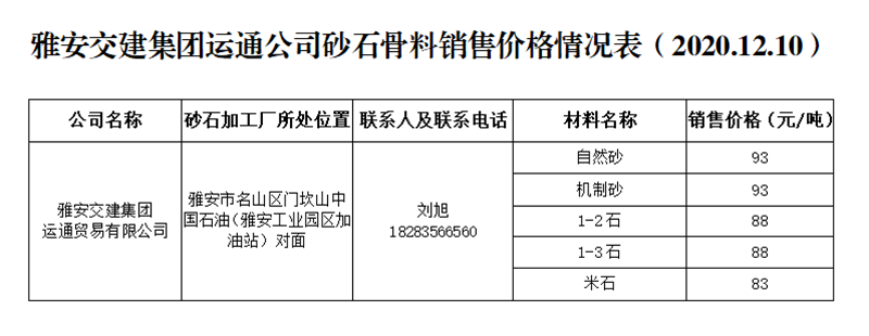 雅安交建集團(tuán)運(yùn)通公司砂石骨料銷售價格情況表(2020.12.10)