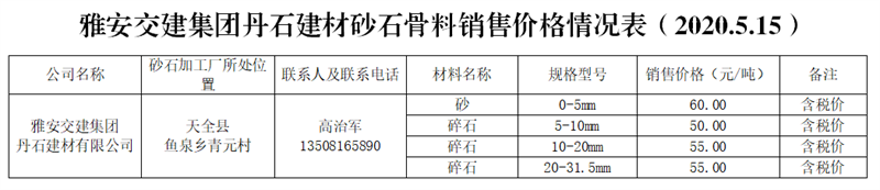 丹石建材有限公司。丹石公司是天全縣人民政府指定天全縣二郎山文化旅游投資開(kāi)發(fā)有限公司與雅安市交通建設(shè)(集團(tuán))有限責(zé)任公司共同組建的合資公司。公司通過(guò)公開(kāi)競(jìng)拍取得儲(chǔ)量2000萬(wàn)方的魚(yú)泉獅子山灰?guī)r礦,并在天全縣魚(yú)泉鄉(xiāng)青元村建立砂石骨料生產(chǎn)線(xiàn),設(shè)計(jì)年產(chǎn)能200萬(wàn)噸。目前,礦山開(kāi)采項(xiàng)目處于在建階段,砂石生產(chǎn)加工廠(chǎng)區(qū)處于設(shè)備調(diào)試和產(chǎn)能驗(yàn)收階段。生產(chǎn)廠(chǎng)區(qū)距雨城區(qū)中心城區(qū)約50公里。