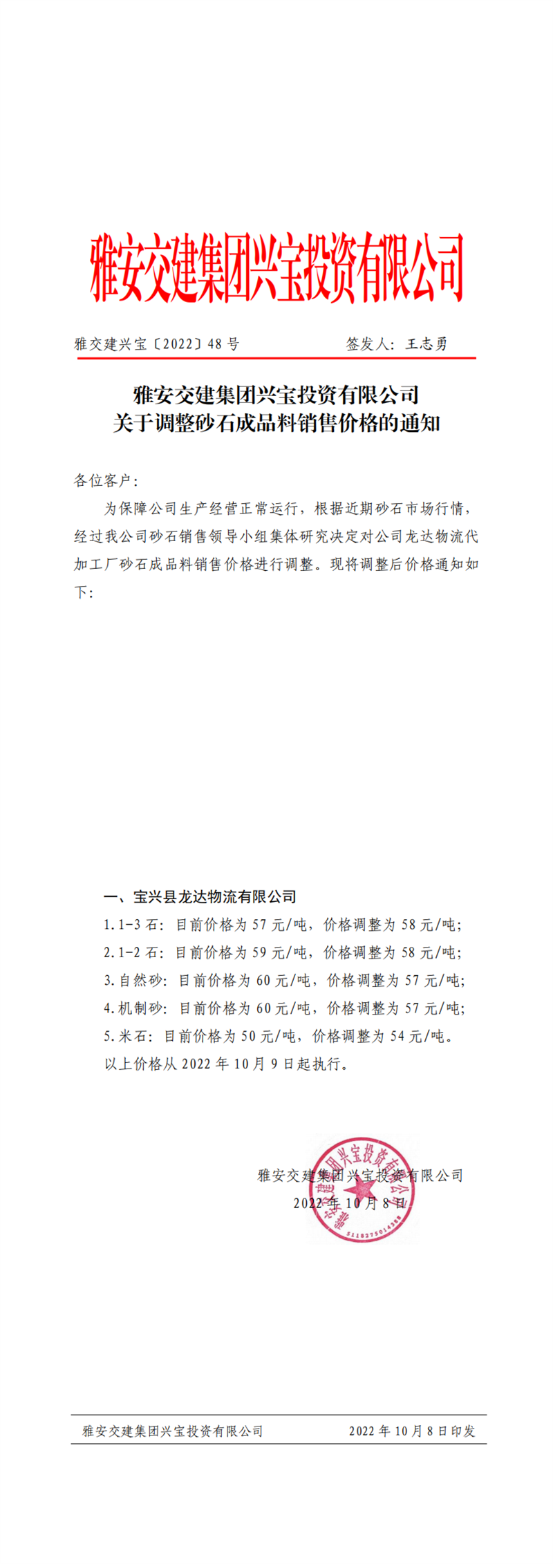 雅交建興寶〔2022〕48號(hào) 關(guān)于調(diào)整砂石成品料銷(xiāo)售價(jià)格的通知10.8