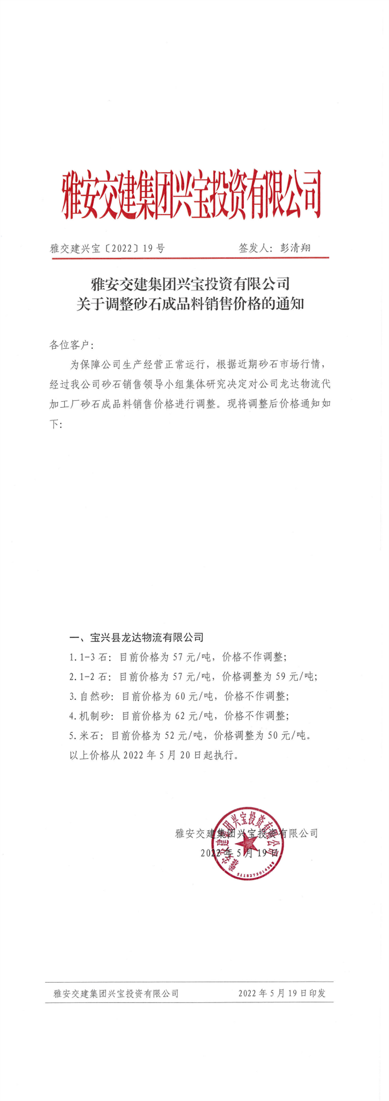 ÑŰ²½»½¨¼¯ˆF(tu¨¢n)ÔÆÊ¯½¨²ÄÓÐÏÞ¹«Ë¾ êP(gu¨¡n)ÓÚÕ{(di¨¤o)Õû³ÉÆ·Áσr(ji¨¤)¸ñµÄ֪ͨ--2022-5-25