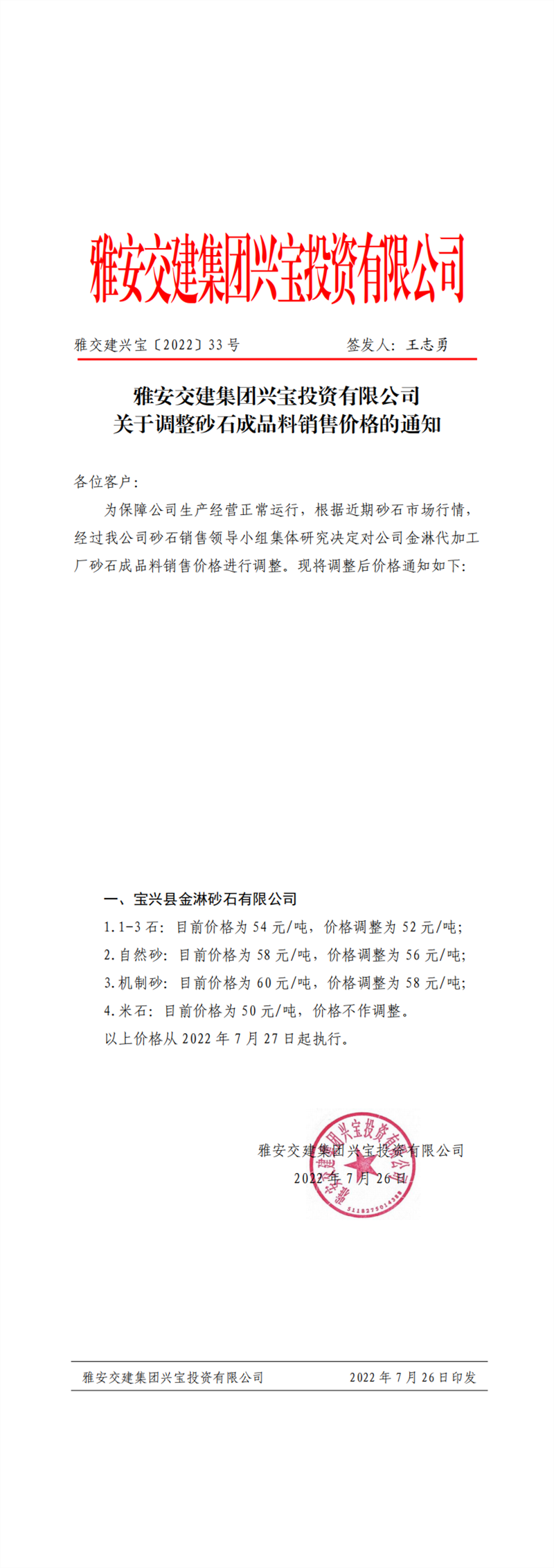 雅交建興寶〔2022〕33號 關(guān)于調(diào)整砂石成品料銷售價(jià)格的通知--7.27