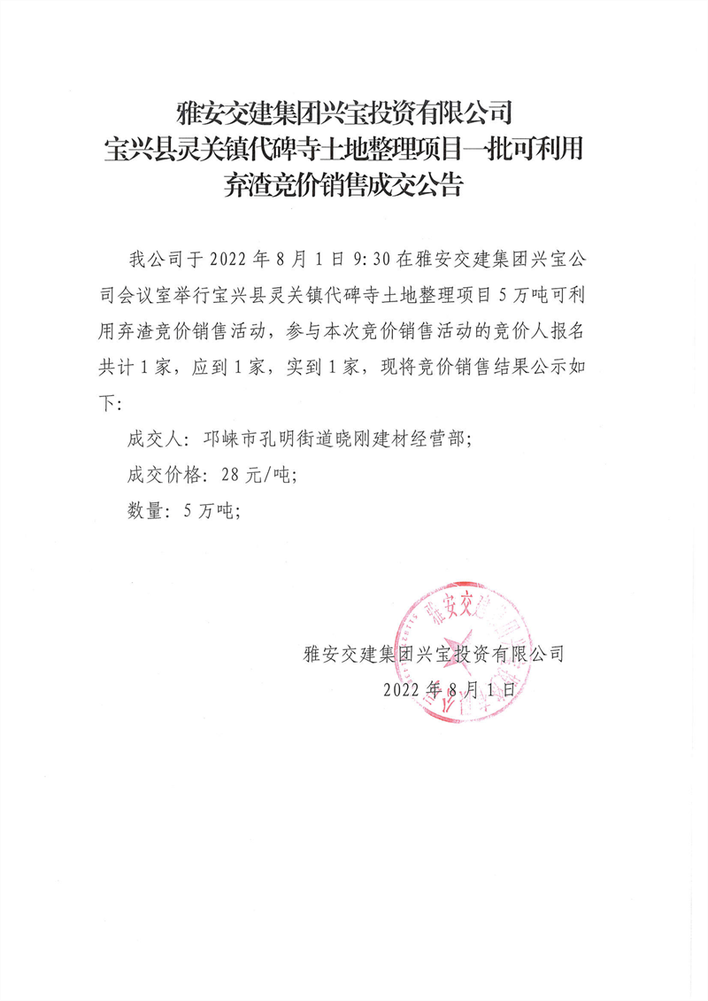 雅安交建集團(tuán)興寶投資有限公司靈關(guān)鎮(zhèn)代碑寺土地整理項(xiàng)目10萬(wàn)噸可利用棄渣競(jìng)價(jià)銷(xiāo)售成交公告(2022.8.1)