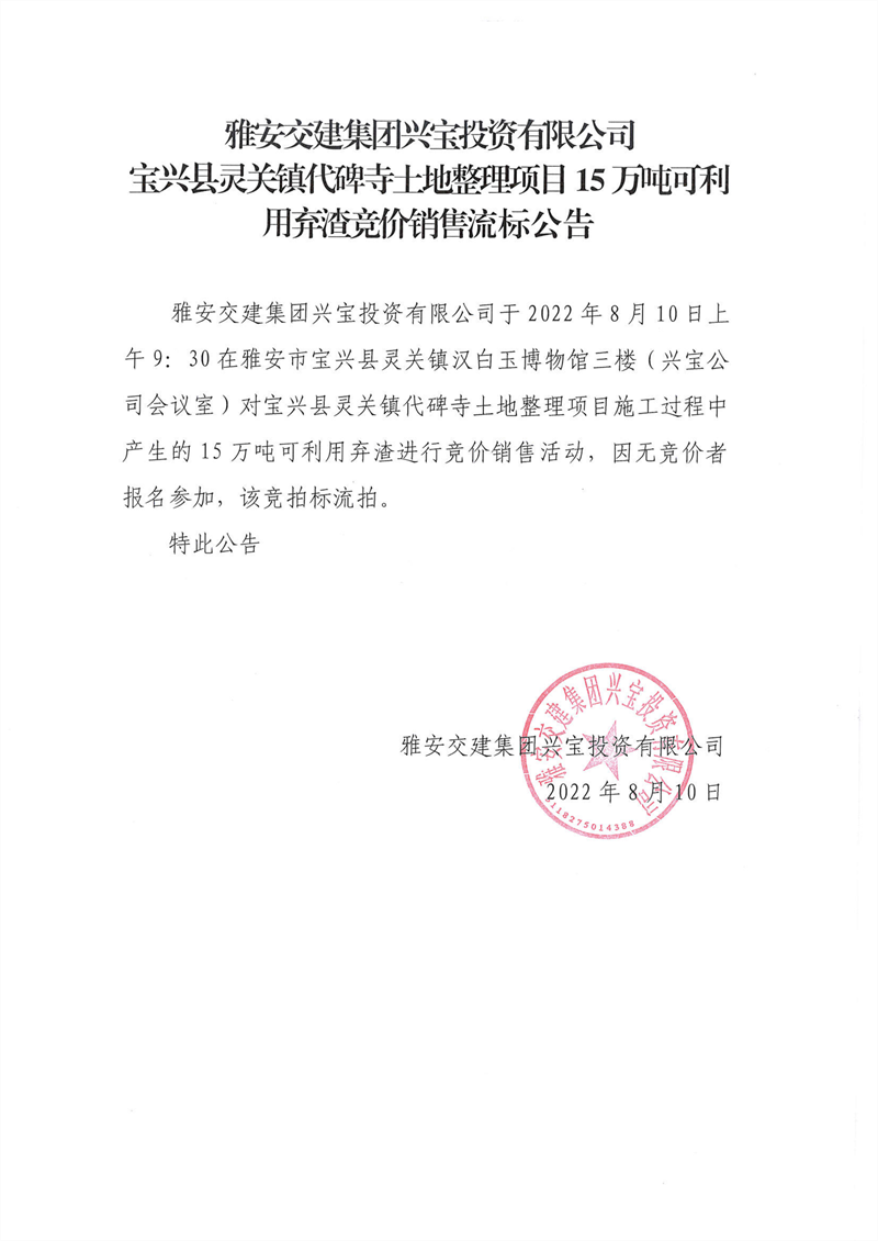 雅安交建集團興寶投資有限公司靈關(guān)鎮(zhèn)代碑寺土地整理項目15萬噸可利用棄渣競價銷售流標(biāo)公告
