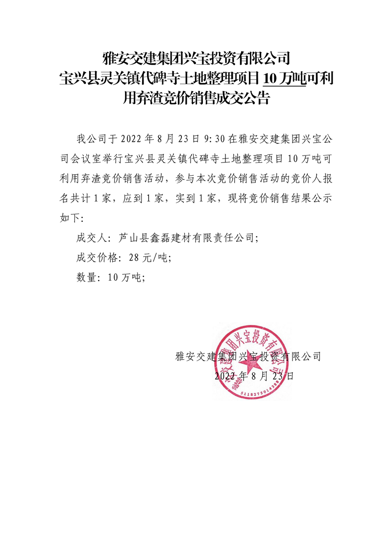 雅安交建集團興寶投資有限公司寶興縣靈關鎮(zhèn)代碑寺土地整理項目10萬噸可利用棄渣競價銷售成交公告(8.23)