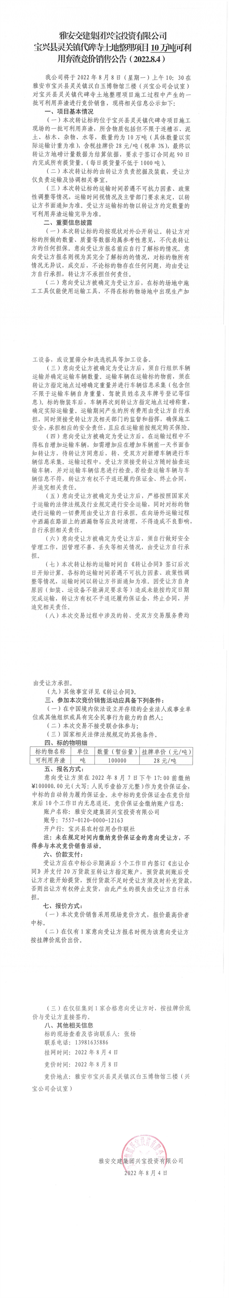 雅安交建集團(tuán)興寶投資有限公司靈關(guān)鎮(zhèn)代碑寺土地整理項(xiàng)目15萬(wàn)噸可利用棄渣競(jìng)價(jià)銷售公告(2022.8.4)