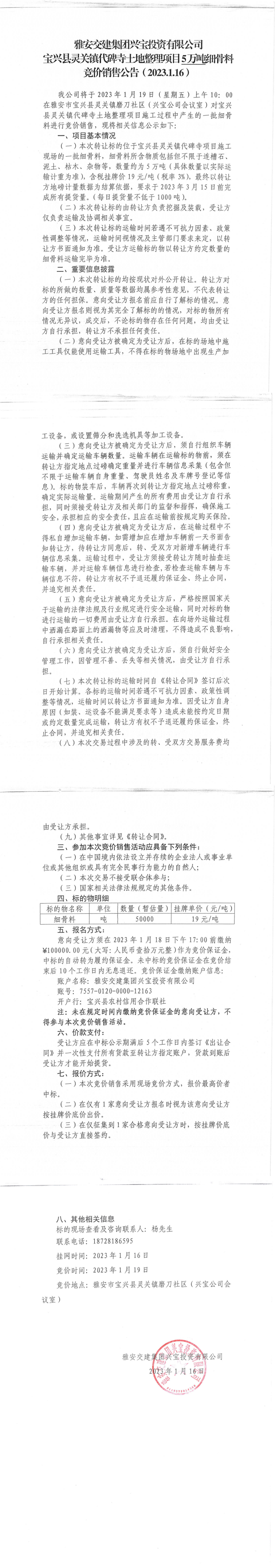 雅安交建集團(tuán)興寶投資有限公司寶興縣靈關(guān)鎮(zhèn)代碑寺土地整理項(xiàng)目5萬噸細(xì)骨料競(jìng)價(jià)銷售公告(2023.01.16)