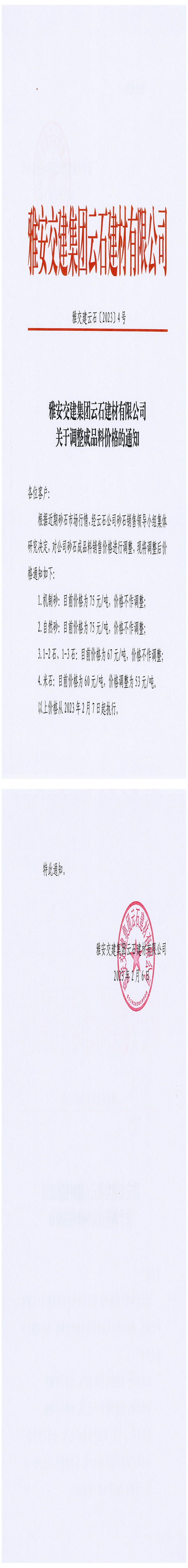 雅安交建集團(tuán)云石建材有限公司關(guān)于調(diào)整成品料價格的通知-2023-02-06