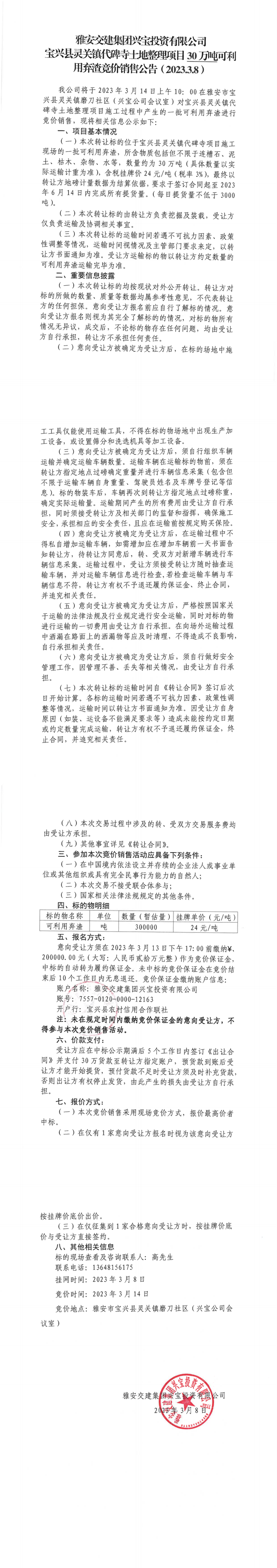 雅安交建集團興寶投資有限公司靈關鎮(zhèn)代碑寺土地整理項目30萬噸可利用棄渣競價銷售公告(2023.3.8)