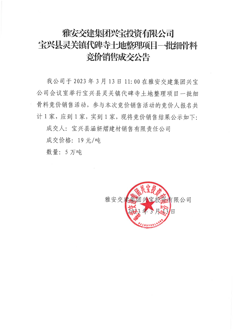 雅安交建集團興寶投資有限公司30萬噸可利用棄渣競價銷售成交公告、5萬噸細骨料竟價成效公告(2023.3.14)