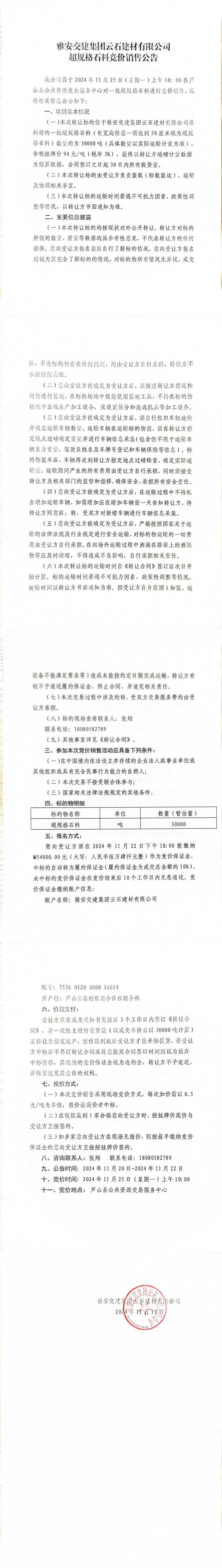 雅安交建集團(tuán)云石建材有限公司超規(guī)格石料競(jìng)價(jià)銷(xiāo)售公告(2024-11-19)