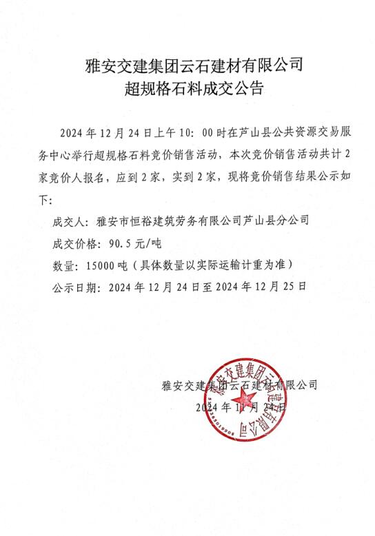 雅交建云石建材有限公司超規(guī)格石料成效公告(2024-12-24)