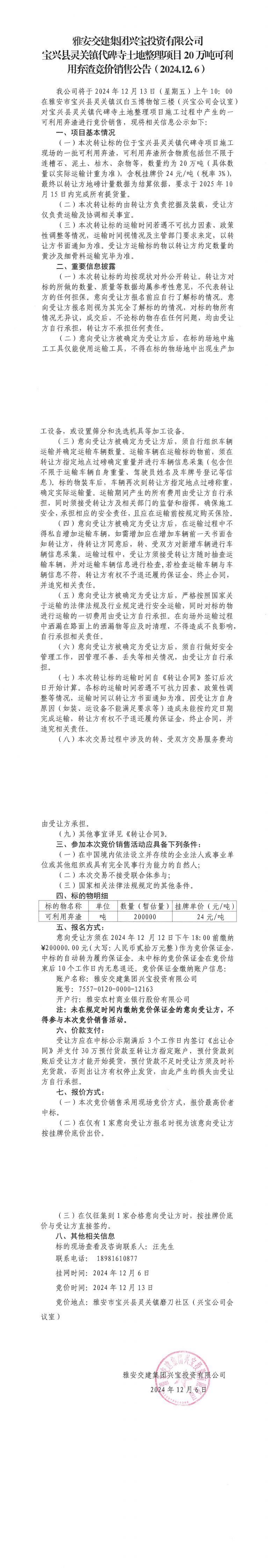 雅安交建集團興寶投資有限公司靈關(guān)鎮(zhèn)代碑寺土地整理項目20萬噸可利用棄渣競價銷售公告(2024.12.06)