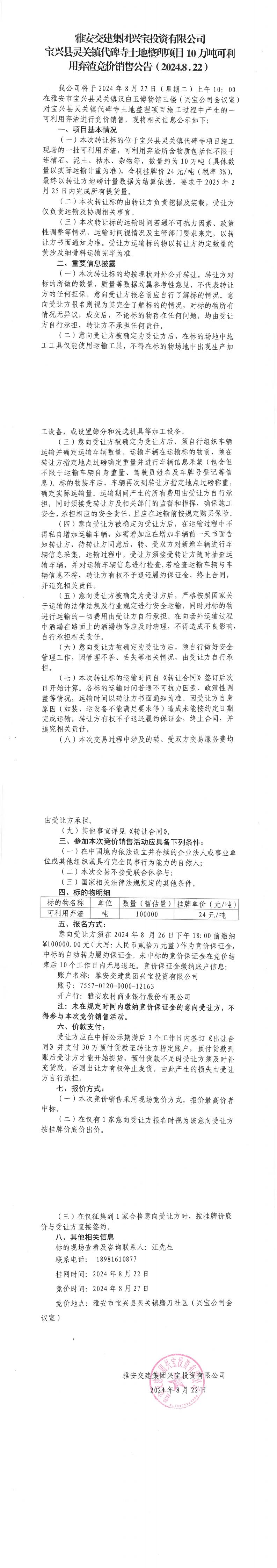 雅安交建集團(tuán)興寶投資有限公司寶興縣靈關(guān)鎮(zhèn)代碑寺土地整理項(xiàng)目10萬噸可利用棄渣競價銷售公告(2024-8-22)_0