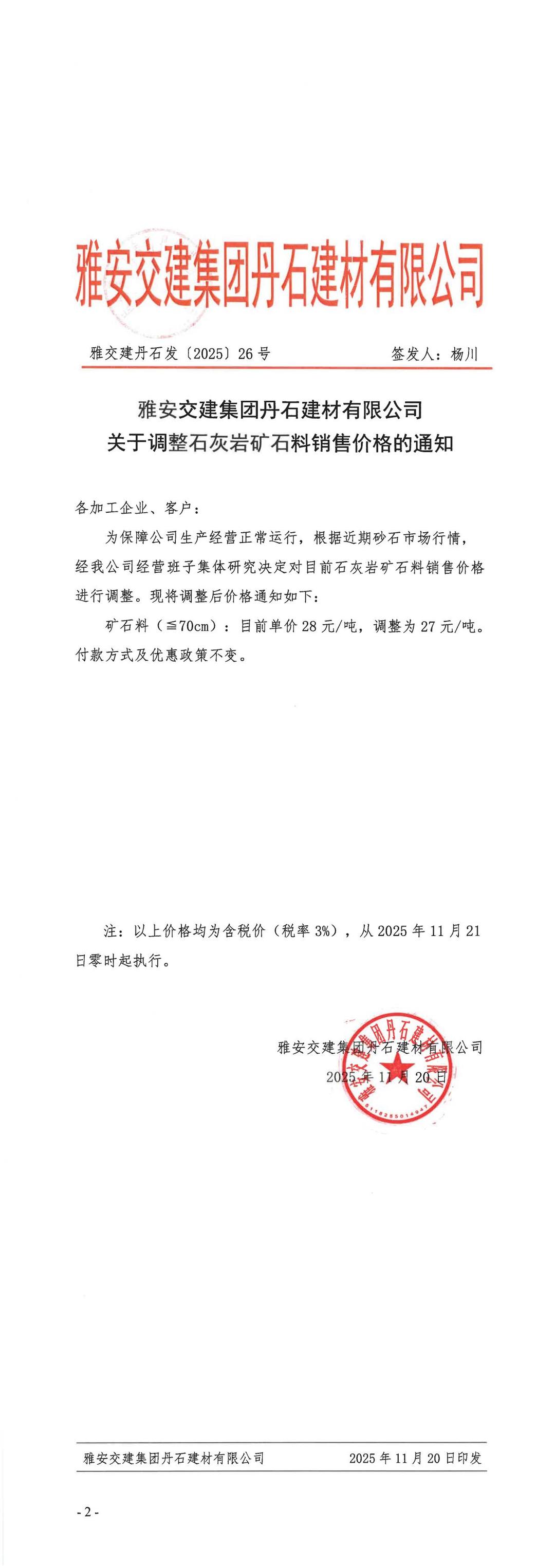 雅安交建集團云石建材有限公司關(guān)于調(diào)整石灰?guī)r礦石料銷售價格的通知(2025.11.20)