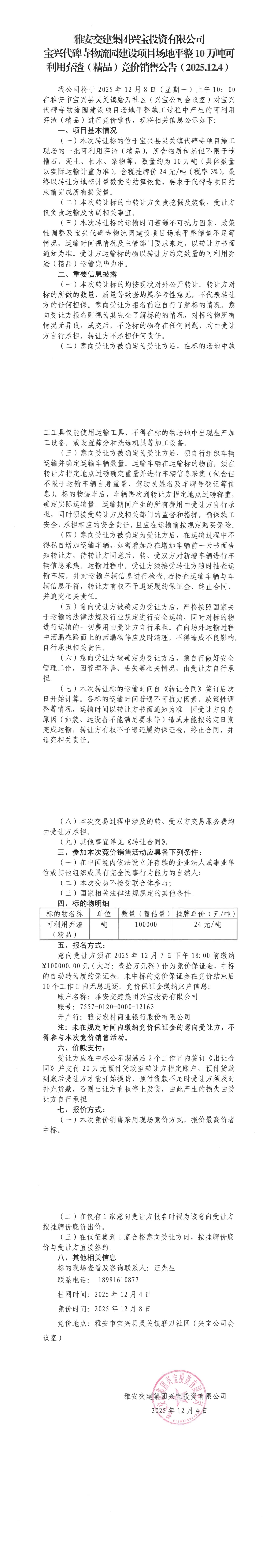 雅安交建集團(tuán)興寶投資有限公司10萬噸可利用棄渣(精品)競價銷售掛網(wǎng)公告(2025.12.04)